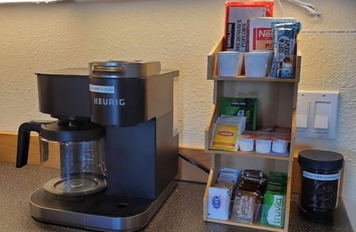 - The fully stocked chef's kitchen includes a Keurig and a drip coffee maker, along with starter coffee, creamer, tea, hot chocolate, popcorn, and snack bars