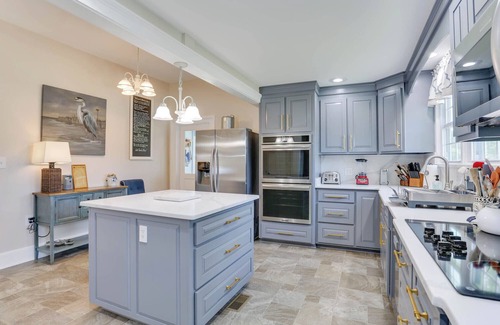 Enjoy the completely remodeled chef's kitchen, fully stocked and ready for you. Large refrigerator plus extra fridge on enclosed back porch, double ovens with built-in air fryers, double dishwashers, 36” 5-burner cook-top, dedicated coffee bar, and favorite adult beverage area leaves plenty of room for all the cooks in your group.