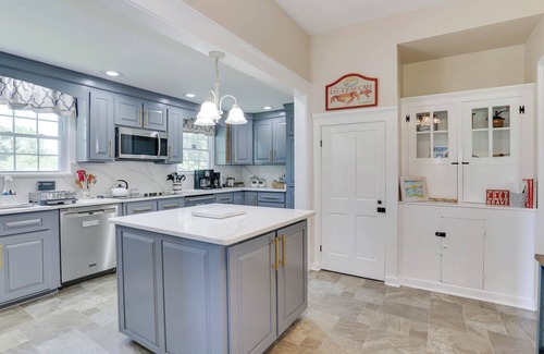 The kitchen cabinets have been built with comfort in mind. Pull-out drawers have replaced shelves so you can easily find what you need. Quartz countertops make clean-up easy. Dedicated baking drawers with supplies. There is an entire cabinet from ceiling to floor of pull-out drawers for our guests supplies.