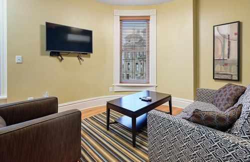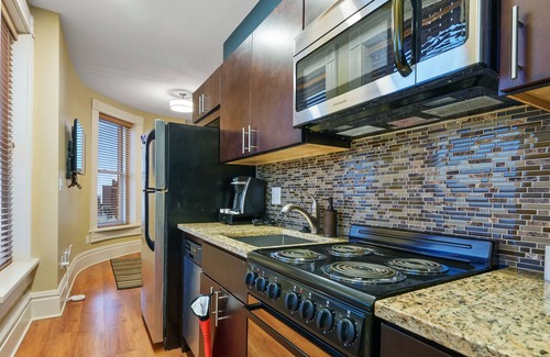 The unit features a cozy living room with a comfortable sofa, a flat-screen TV, and plenty of natural light. The bedroom boasts a plush full-size bed, a dresser, and a closet for ample storage. The bathroom is clean and modern with a shower/tub combo. The fully-equipped kitchen includes a refrigerator, stove, microwave, marble countertops, and coffee maker, along with all necessary cookware and utensils. Not to mention in-unit laundry!