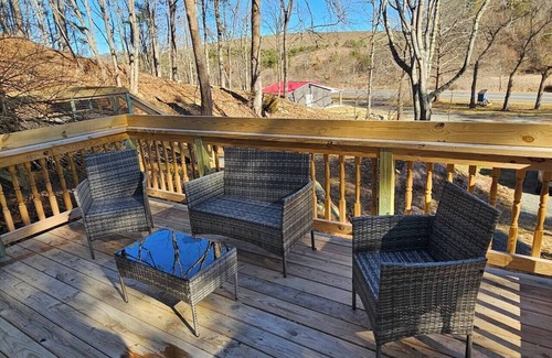 Experience the enchanting Hawthorne! Immerse yourself in New England charm with a cozy queen bed, lofted full bed, arcade games, LED TV, mini fridge, microwave, and a spacious deck with fire pit. Surrounded by nature trails and close to the New River, it's the perfect blend of comfort and adventure!