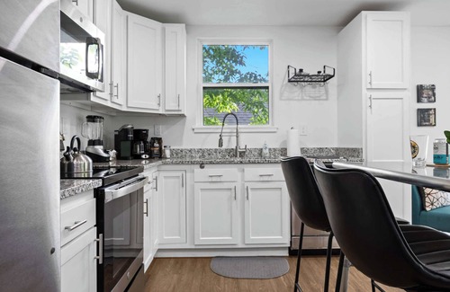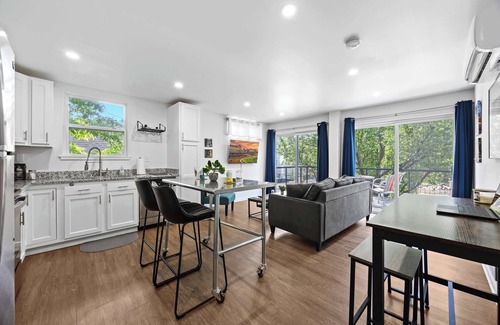 Guests can enjoy access to a shared yard, a rare feature in NuLu. Inside, each unit boasts a modern kitchen equipped with stainless steel appliances, complemented by abundant natural light streaming through large glass doors and windows. Perfect for groups visiting Derby, Bourbon & Beyond, or Forecastle.