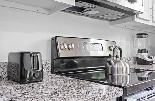 ▻ Kitchen with stove, oven, fridge, microwave oven, basic cookwares, drip coffee machine, Keurig machine, dishwasher
