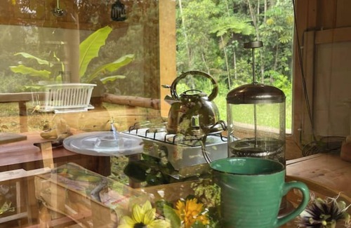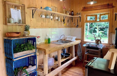 Breakfast is included and is waiting for you in the well equipped kitchen. Nice to know that amongst others you can also order an ingredient box to prepare you lunch or dinner. The cabin is located on 22 hectares in a conservation and permaculture project. There is no need to leave the property at all.