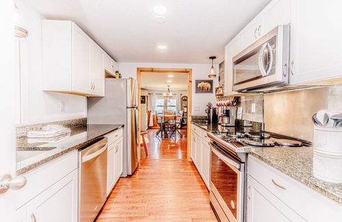 Recently updated and curated for your complete comfort, the interior of this home is cheerful, inviting, and spacious. Lounge in the bright living room where the seating is soft, the TV is large, and the warmth of the gas fireplace is delightful. Enjoy a large kitchen with stainless steel appliances and ample meal prep space. Dine together at the wooden dining table or on the patio.