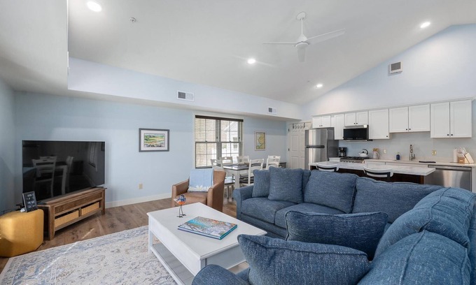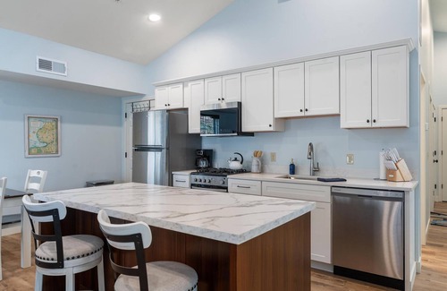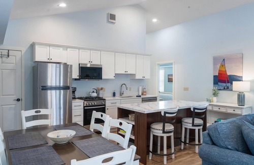 Step into the open-concept living area, where vaulted ceilings and cozy furnishings invite you to relax. The fully equipped kitchen includes everything you need to cook meals at home, and the raised counter bar makes a perfect spot to sip a glass of wine while dinner comes together. The two bedrooms offer restful retreats just down the hall—one with an en-suite bathroom for added privacy and leisurely mornings. An in-unit laundry area is conveniently located in the hallway, ideal for extended visits.