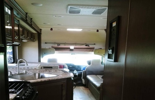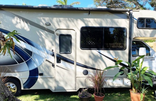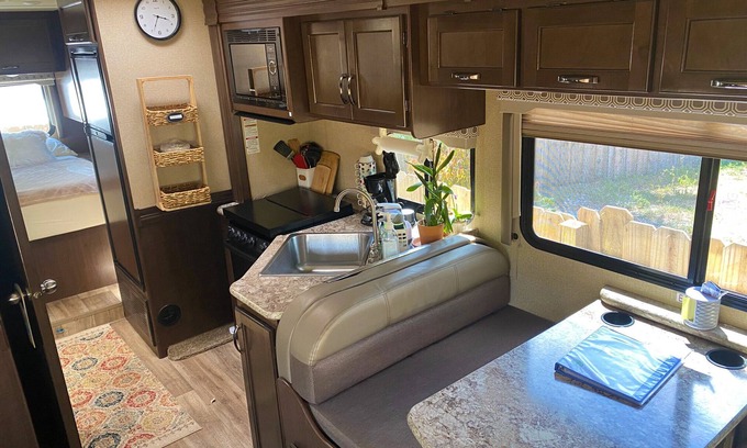 Vacation under a live oak hammock in the heart of the Jupiter Inlet Village. This one-bedroom, 28’ RV provides an economical and relaxing vacation with increased living space in the bump-out. The skylight bathroom has shower, sink, and porcelain toilet.