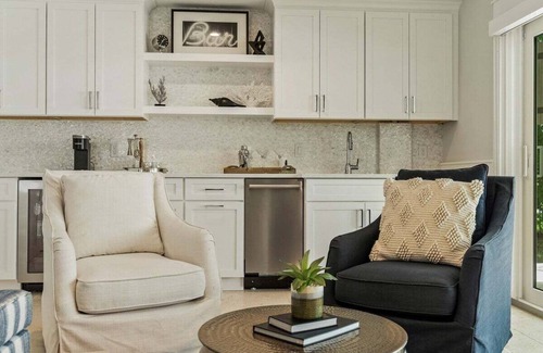 The ground level bonus room features a wet bar, which includes a refrigerator, ice maker, dishwasher, sink/garbage disposal acting as second kitchen for the guest suite. In addition you will find a custom-built queen murphy bed, a 65 Smart TV, and four comfortable chairs that overlook the stunning pool deck where you will find you and your family spending a lot of time relaxing and making memories.