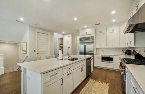 Enjoy the provided beach and pool essentials, which include beach chairs, a beach wagon, beach floats, and pool floats. This stunning home is within walking distance to the bay and several near by popular restaurants - Shore, Miravista, Whitneys Bodega to name a few!