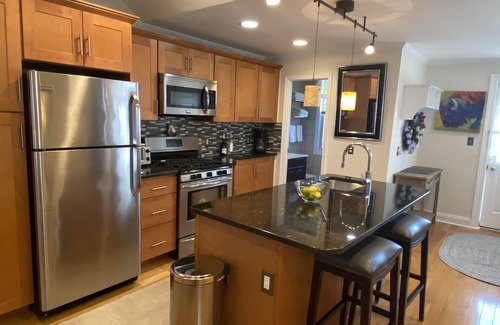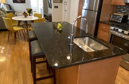 Our Apt has a Great Room which features center granite top island & full delux kitchen. Eat or work seated on the island’s leather top stools or enjoy the marble top table for your comfort. The great room features new 65” state of the art wall hung TV & streaming programming for your enjoyment. The bedroom features a Queen size Sealy Trust ll super comfort mattress & a wall mounted electronic fireplace for relaxing rest & in winter months extra cozy warmth. If you are traveling with more then 2 persons or have need for 2nd bed, the sofa in the great room opens to another queen size bed . hardwood floors throughout, area rugs, & interesting art on the walls gives this Apt sparkle. This Apt has its own private rear & front entrances. There are coin operated washers & dryers for your use in the bldg basement.