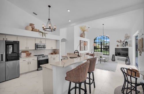 Elegant and beautifully-appointed three bed and three bath villa in Port Charlotte Florida. Private pool with seating for relaxation. Master suite with pool side access and sliding door to enjoy the Florida breeze.