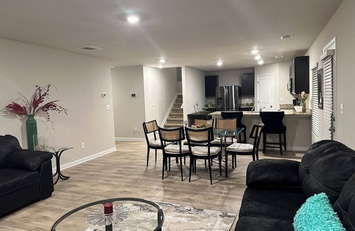 Located in Ellenwood, this extra large charming home is a dream. With 5 bedrooms including 2 king beds and 3 queen beds, guests will have plenty of space to unwind. The property offers a king size master bedroom that’s great for grand parents, with just a shower on main & the master suite is upstairs with tub/shower, plus all other rooms. In addition, there’s AC/heat, washing/dryer, hair dryer, WiFi, & an iron for convenience. Shops, stores & restaurants are near and quick access to expressways. There’s a small back yard, but plenty of yard on each side. Kickback, relax, and enjoy everything our house in Ellenwood has to offer. We’ve just furnished this home, so more pictures to come.