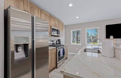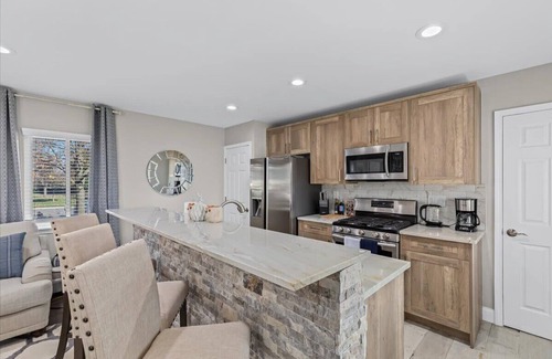 Enjoy a stylish experience at this centrally-located apartment with a townhome feel. Step into comfort in this 2 BR 1.5 BA, stylish apartment, with kitchen table to easily accommodate a corporate group, traveling nurse crew or traveling family!