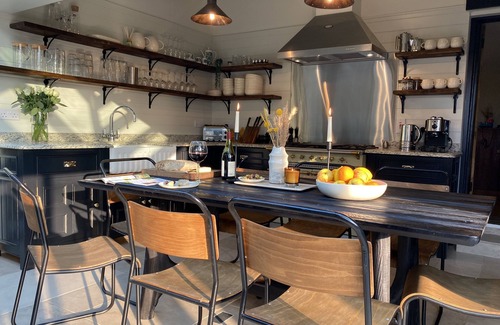 Kitchen Diner: This is a stunning space with landscape pitched roof, a contemporary industrial theme, stone floor and exposed painted brickwork. There is a large Butlers sink, freestanding range cooker, dining table and chairs to seat 8, and rows of exposed shelves for crockery and glassware. There is also a door to the garden from here.
