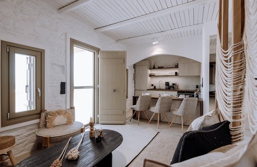 The villa's interior and exterior are adorned in brilliant white, complemented by tasteful ethnic decorations, creating a harmonious blend of Mykonian elegance and island spirit for an immersive experience.