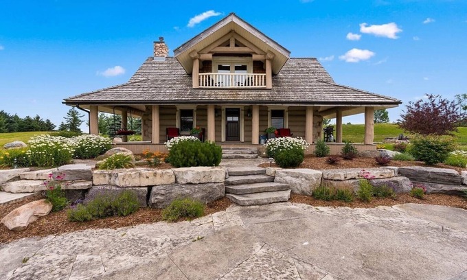 Very private custom crafted log cabin nestled on scenic surroundings overlooking a beautiful spring fed pond and picturesque view of Blue Mountains.
