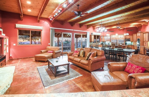 Welcome to your very own desert oasis! Set on 10 gorgeous acres, this 3,850-square-foot custom-built ranch home with 16ft ceilings throughout is the ideal destination for your next big family getaway. After winding down the palm tree-dotted driveway, enter a private, fenced front courtyard with lush landscaping before you step through the front double doors and find yourself in a central great room beneath a soaring, exposed beam ceiling. The well-equipped gourmet kitchen to the right features stainless steel appliances, including two wall ovens, two dishwashers, and two side-by-side refrigerators, as well as gorgeous granite countertops and cabinets brimming with utensils, dishes, and other accessories. Enjoy meals together indoors at the enormous table, or step outside to the furnished and shaded patio, fire up the gas grill, and enjoy an al fresco, poolside experience. The fenced backyard includes a private pool that can be heated for an additional fee, a hot tub, and plenty of beautiful landscaping to admire while you soak up Arizona sunshine. Also, enjoy the spectacular sunsets or marvel at the amazing stars at night!