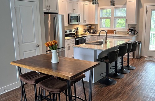 Your stay includes two, spacious master bedrooms with their own master bathroom, a full kitchen set up with access to everything you need to prepare meals, a custom-made dining table that seats 4, a deck with seating to enjoy a wooded view of the sunset as you dine, an electric fireplace, TV access (bring your own streaming passwords), and a half bath on the main level. *Note for allergy purposes--a kitty does reside on this property.