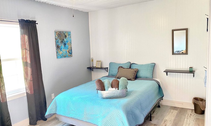 1 plush queen bed with linens/pillows. 1 sectional couch for extra guests (no linens provided). A full array of necessities in the kitchen are provided. The detached Bathroom is connected to the cottage beneath the porch 10 feet from the entry, it offers two showers, sink, toilet. Towels are provided in the unit. There are a ton of amenities located on the property from games in the coffee table, corn hole, disc golf, hiking, biking, or just meditate by the pond located behind the main house 1/4 mile down from your reservation stay. And the Rolling Fork River put in ramp is only 5 minutes drive away. If you'dlike to swim/fish/boat. We share the property with our guests openly, Just let us know if you have any questions about any of the areas access points.