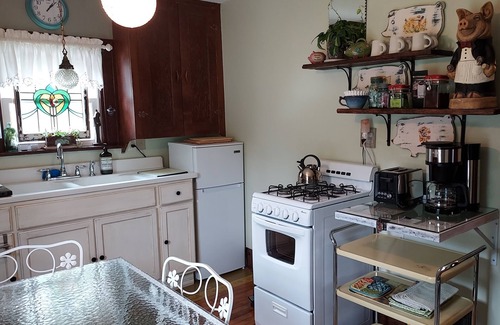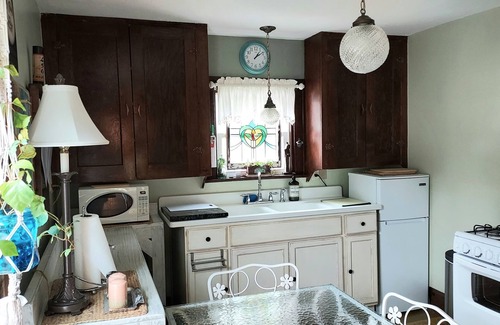 * Ezmeralda's is artistically filled with vintage treasures and modern touches throughout. A distinctive blend of furnishings and accessories, creating an eclectic atmosphere of "perfectly imperfect! " The sitting room, consisting of 2 walls of windows enhances the room with natural lighting. The cottage wicker furniture calls you in to sit down, put your feet up, and relax. Do some bird watching! Natural lighting embraces all the rooms throughout this bungalow. Two bedrooms, each one provides a full size (double) bed, dressed in new bedding and accessories. Linens, pillows, blankets, etc. are provided. The serene ambiance of these charming bedrooms provides you with a good night's sleep! From the 1920s, the original double drainboard sink completes the fully equipped classic bungalow kitchen. Original hardwood flooring throughout. The bathroom boasts the original 1920's free standing soaking tub, with an overhead shower. Towels, shampoo, soaps, etc. provided. All you need are your personal belongings! This bungalow is a must-see! Come check us out!