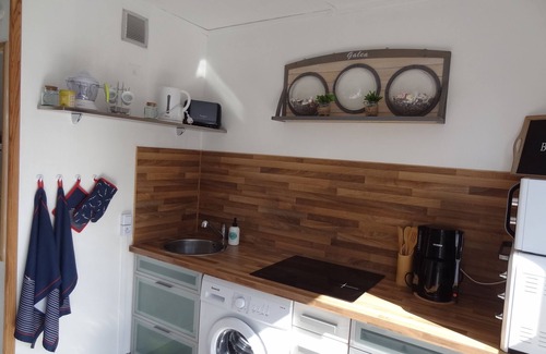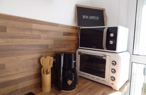 A living room with a lounge with a sofa bed for two people (Mattresses Dunlopillo), with a TV and WiFi. The kitchen area has a mini-oven, a microwave, a fridge, a washing machine (pods provided), a kettle, a coffee maker, a juicer , a toaster and various basic products such as salt, pepper, sugar, oil, vinegar, tea (Coffea) and coffee (Carte Noire). A set of 8 plates flat, hollow and dessert are also available with cutlery and water glasses, wine, beer, champagne, coffee cups, and mugs (liquid-dish supplied).