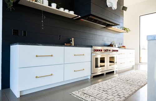 Farmhouse table seats 10 guests with views of the 24 by 48ft heated pool and mountain vistas beyond. Panoramic windows and sliding doors open to the poolside patio with ample outdoor seating and grill. The property is placed to enjoy mountain views on three sides! Clad in black ship lap and stone, High Barn is reminiscent of the vintage barns found scattered across the Suffolk countryside in England, while the open and modern interiors give the relaxed Cali vibe and the clean lines offer Scandinavian simplicity.