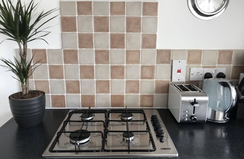 The modern kitchen has an oven with four ring hob over, sink with drainer with mixer tap over, partly tiled walls, washing machine, microwave oven, brand new kettle and toaster and is very well equipped.