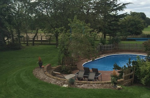 It has fantastic uninterrupted 1st floor views over the garden, swimming pool for the house use & fields beyond.