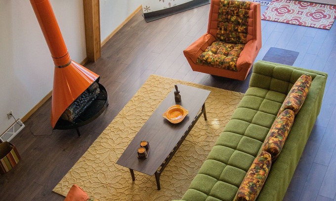 The house features (2) bedrooms, an open concept kitchen with modern cabinetry, new appliances, coffee maker, microwave, toaster, and new cookware. There's a fab electric orange Preway fire place, vaulted gable ceiling with exposed pine beams and is tastefully furnished in the colors and styles of the day. Also included is a restored vintage console stereo and a collection of 70’s vinyl for your listening pleasure.
