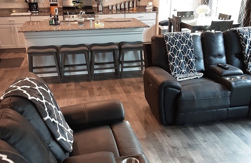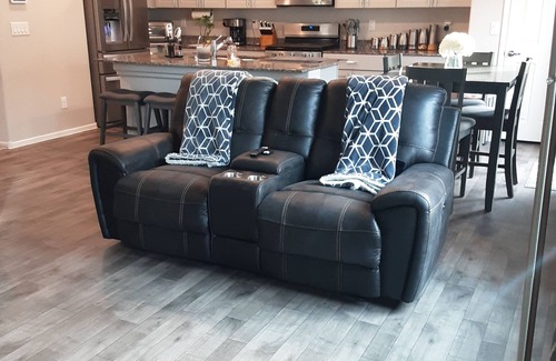 This townhome is new and contemporary ready for a family or small group of friends who want to experience "Local Las Vegas!" The fully furnished open kitchen and island is sure to entice anyone to "meal prep" and the power recliner sets are guaranteed to put anyone to sleep in front of the 75in smart TV in the living room! The private backyard is full with a gas BBQ and seating for four, secluded behind 6ft CMU wall.... This townhome is a corner lot in a private, gated community that is quiet and nestled in the northern foothills... Far enough away from the hustle and bustle of tourism, yet close enough to reach in a 20 minute drive...... Walmart, Costco and Target are a 5 minute drive away and you'll find several eateries in the adjacent complexes. Guests can exercise "self-care" at Planet Fitness or LVAC and take a dive in the private community pool at their leisure... You'll know you living among royals when you see crowns throughout this gorgeous townhome!!!
