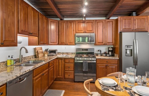 Faeya Grove is named for the Russian word for “Fairy” and our beautiful redwood groves. Newly remodeled with family vacations in mind, you’ll love the updated kitchen and bathrooms as your family adventures throughout Sonoma County and unwinds at the house. Comfortable beds, high speed wifi, a designated workspace, and room for the kids to play, Faeya Grove is also an ideal location to work remotely.