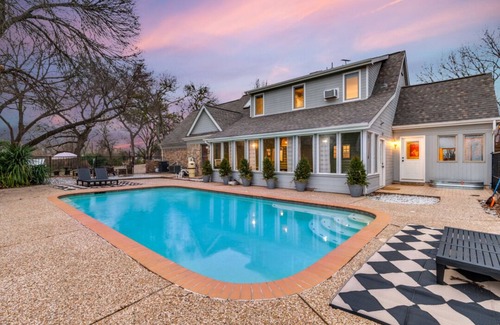 Welcome to Faire La Fête Manor, a sprawling creek lined property, boasting 2.5 acres and dozens of large trees. The canopy covered, retreat like, 3000 sq. ft Party Patio with gorgeous light strands, and trees wrapped with lights, is the setting in the front of the home. A swimming pool on the back patio is paired with a sunroom, that has a panoramic view of the swimming pool and creek. Inside the home you will find an awesome game room, outfitted with 2 TV’s, Pool Table, Shufflboard Table, and additional high end furnishings for your group’s comfort!The Master suite is located upstairs. With 2 bedrooms located downstairs. The large gathering areas including Living Room, Wet Bar, Formal Dining Room, Dinette, Kitchen and Sun Room can accommodate large gatherings.
