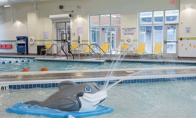 An indoor pool and a children's pool are on site. Other recreational amenities include a waterslide and a 24-hour fitness center.