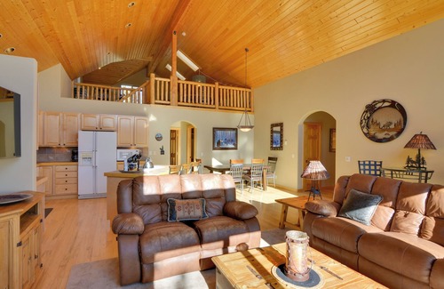 Take your family or friends on a getaway to Fairplay at this quiet 3-bedroom, 3-bath vacation rental. Lounge by the fireplace in the high-ceiling living room, grill out on the spacious balcony, or have a drink at the bar while taking in scenic mountain views. Play a round of pool, darts, or sing karaoke in the game room. Watch a movie from the video library or play a board game in the loft. Several hiking trails, world-class fly fishing spots, and downtown Fairplay attractions are also nearby!