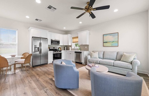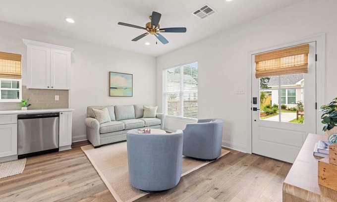 Welcome to Fairway Cottage—your private 2-bedroom retreat in Parkside, Youngsville’s newest boutique cottage court. Located just steps from Foster Park and the Youngsville Sports Complex, this stylish stay features 2 Helix queen beds, a fully equipped kitchen, a sleeper couch, and all the comforts of home—perfect for families, teams, or weekend escapes.
