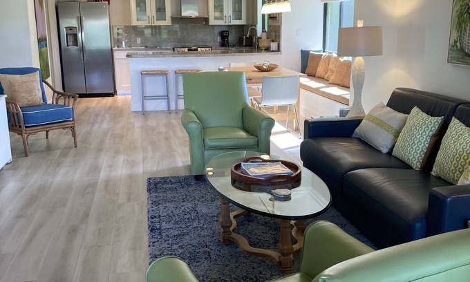 The Living area has a leather couch and two large sitting chairs, plus 2 additional chairs. For entertainment there is a 46 inch flat screen TV equipped with cable and internet access. The living area has two sets of glass sliding doors that open up to a screened-in porch with two very comfortable lounge chairs, a bistro table and seating that provides a beautiful golf course view and serene atmosphere to enjoy morning coffee, a nap or sunset glass of wine.
