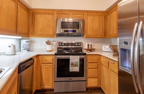 This 2 bedroom/2 bath condo is located on the ground level and will sleep up to 4 guests. The living area has a gas fireplace and 55-inch flat-screen TV. There is access to a small deck with a table and chairs and Mt views. The fully stocked kitchen has granite countertops, stainless steel appliances, and 2 bar stools at the countertop. There is a laundry room off the hallway with a full-size washer/dryer.
