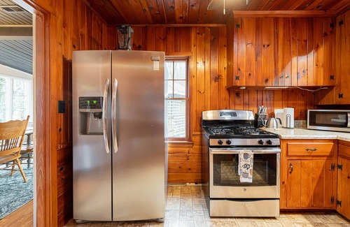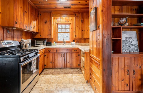 This modern 3 bedroom, 2 bathroom cabin offers a tasteful blend of rustic charm and modern finishes. The main level is cozy and inviting, featuring classic wood paneling, a gas log fireplace, and a picturesque dining room. Enjoy cool summer mornings and afternoon rain showers from the attached gazebo. The lower level features a spacious covered deck and light-filled living quarters.