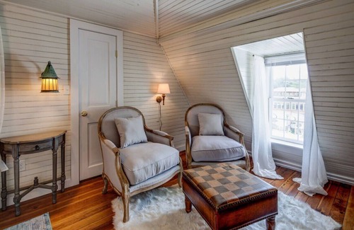 The white and airy decor of our Fairytale Loft Suite, offset with the dainty metallic fixtures, original heart pine floors, and soothing blue rug, make your stay here feel magical. This quiet and romantic loft suite features a King bed and lace hammock positioned by the window with views of the mountains in the distance - a great spot to recline and unwind. The charming bathroom includes a custom-designed tiled shower and a few other unique touches that complement the rest of the suite.