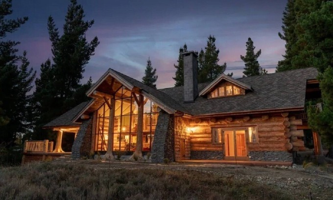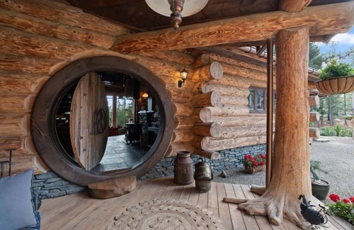 Fairytale Log Cabin at Homewood Retreat is nestled among a beautiful pine forest with mountain views in the distance.