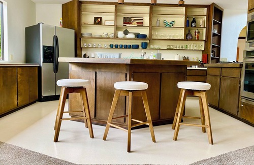 - Unique Rustic Charm: The custom-built ranch-style home features a captivating retro vibe, high open beam ceilings, and a cozy stone fireplace, creating a warm atmosphere for gatherings before and after the ceremony.