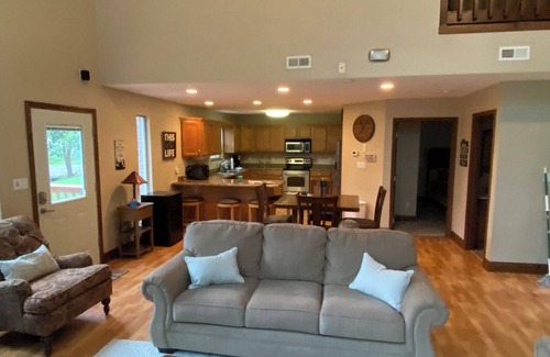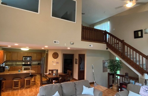On the main level you will find a fully stocked kitchen, large living room, Queen bedroom, additional Queen pull out sofa, and a full bath. Upstairs is the master bedroom suite and attached full bath with jacuzzi tub. There is also a sitting area with a full pull out sofa with memory foam mattress. The lower level offers a Queen bedroom and an additional pull out sofa with a full memory foam mattress and a 1/2 bath.
