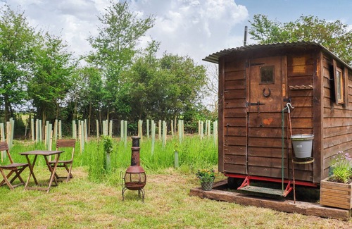 Bedroom area: Sofa Bed. Solid fuel wood burning stove, camping gas stove, bed linen and towels included. Initial fuel for wood burner included. Welcome pack. External shower room with camping shower and composting toilet. Enclosed front garden with sitting-out area, garden furniture and fire pit. Off street parking. No smoking. Please note: No children or pets or smoking of any kind on site.. This timber shepherd’s hut has the necessary amenities for a comfortable stay, with a sense of cosiness and warmth, making it an ideal setting for a couples’ romantic getaway or a peaceful retreat for two. This unique experience allows you to immerse yourself in nature and escape the hustle and bustle of daily life, providing a tranquil and secluded environment. Soak up and relax in the idyllic surroundings, peacefully nestled on the owners’ small holding. The hut stands privately, enjoying a beautiful spot in a secluded corner. Whilst being off grid, you have solar lighting inside and out, a wood burner for warmth and private camping shower and composting toilet. A camping stove and kitchen equipment is provided to be fully self-sustained.