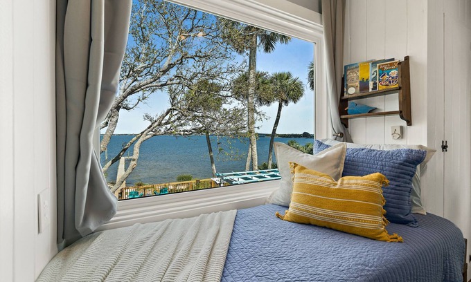 Rio Vista sits right on the beautiful Indian River. It's a 1942 bungalow, packed with Florida charm. Fully fenced yard, great for kids and pets alike. You can walk right out onto a private dock and see native wildlife, fish, paddle board, or just enjoy the view. There is also a jacuzzi on the back deck, a fire pit, and a grill to enjoy. All of the accommodations to make for a perfect vacation.