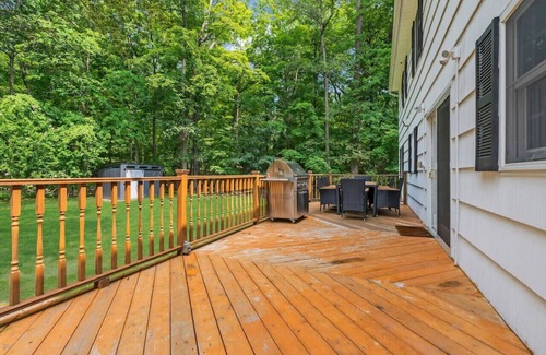 KITCHEN AND DINING The gourmet kitchen boasts state-of-the-art appliances and lots of counter space, where you can prepare delicious meals to enjoy with family. The high-end appliances include a Viking stove, refrigerator, microwave, dishwasher, coffee machine, and blender. The kitchen has pots and pans, cutlery and dishware for your convenience. Make use of the barstools at the island and grab your meals right out of the oven while enjoying the lush backyard views right off the kitchen. The patio is conveniently located right off the kitchen, making for easy access when firing up the grill for a delicious meal. Or, make use of the formal dining room for a family dinner. With enough seating for 16, there is plenty of room for everyone (including a highchair if needed). BEDROOMS This home sleeps 16 comfortably plus infants. Pack and plays are available upon request. The fully equipped laundry room in the basement for your convenience. A washer and dryer are available for your use, as well as an ironing board. Detergent is provided. Bedroom 1: This bedroom includes 2 54’’ beds, and ample closet space. Bedroom 2: The perfect spacious kids’ room, this bedroom has 2 bunk beds, ample closet space. Bedroom 3: This bedroom has 2 39’’ beds and ample closet space. This bedroom has beautiful views of the backyard. Bedroom 4: This bedroom includes 2 54’’ beds and ample closet space. Bedroom 5: This adorable bedroom has a bunk bed and beautiful backyard views. A walk-in closet and workspace. Master Bedroom: This large spacious suite gives you your privacy amid the chaos. Soaring ceilings and beautiful front yard views; a king-size bed with two nightstands; comfortable seating for two; 57-inch smart TV so you’ll never be bored. A spacious walk-in closet gives you space for everything you have, and the spacious bathroom with a standing shower and jacuzzi to pamper yourself. BATHS Bathroom 1: On the main level, this guest bathroom is located near the kitchen, with a standing shower. Bathroom 2: Located on the upper level, off the hallway, this large bathroom has a tub/shower combination. Bathroom 3: Located on the upper level, this bathroom connects to the hallway and Bedroom 1, and has a standing shower. Bathroom 4: Master bath GAME ROOM Being on vacation means staying up until late at night while having fun with friends. The game room in the garage includes pool and foosball tables as well as a basketball hoop, for a good time with friends. THEATER This basement theater is perfect for your movie night. The 57’’ smart TV includes X-box gaming and Nintendo Wii consoles. Gather round on the comfortable couches and dim the lights, movie night is on! OUTDOORS This home is set off the road with a long driveway ensuring your complete privacy. An EV charger is located in the driveway area. Lush landscaping throughout the property is sure to impress. A brook runs alongside the property, and a hammock and outdoor couches let you enjoy the serene surroundings in complete privacy. The backyard is fully fenced for your safety. If you’re in the mood of an outdoor meal, the gas grill and patio set are set on the patio. All outdoor furniture is available seasonally. Guest access The entire property is available for your use! Enjoy spending time in this beautiful home and relaxing in the beautiful outdoors.