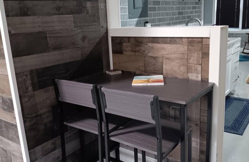 Family room sofa/futon sleeping for 2, 2 fireplaces, ac and smart tv. Fully equipped kitchen, towels and lines provided.
