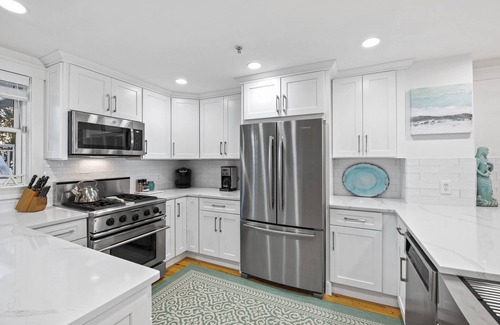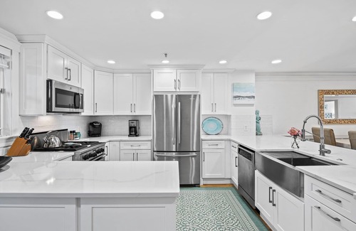 Upstairs, the open kitchen and living room have been completely updated with top-of-the-line furnishings, premium stainless steel appliances, and all-white cabinetry. There is a banquette with seating for 6 and an additional 2 seats at the breakfast bar for guests to enjoy a meal together. The kitchen also has a separate entrance to the outside, while beautiful Gulf and pool views fill the room from the other side. There is a spacious living area with 2 sofas, chairs, a flat-screen TV, and outdoor seating on the balcony. There are also 2 bedrooms on this floor, both with king beds, balcony entrances, and private bathrooms.