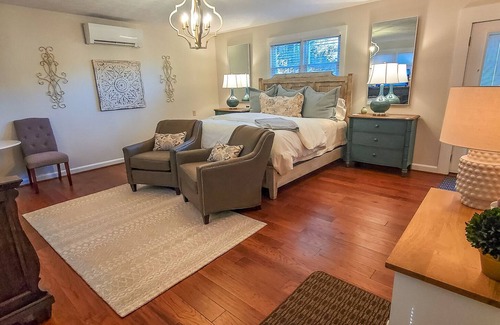 This spacious upstairs studio style cottage is expertly designed and decorated in luxury farmhouse style. Complete with seating, a comfy king-sized bed, kitchen, dining table, and bath with step-in shower, it accommodates two with plenty of place. A smart TV is also provided as well as Wi-Fi.