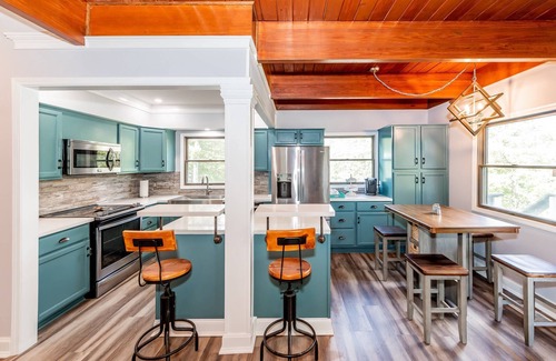 Enter into the open-concept main floor with eat-in kitchen that offers all stainless steel appliances, granite countertops and kitchen island with high-top seating for two. A wooden high top dining table offers seating for 4. The kitchen is fully equipped with a toaster, microwave, blender, mixer, and all other essentials for cooking scrumptious meals. A Keurig Coffee system is available on the coffee bar.