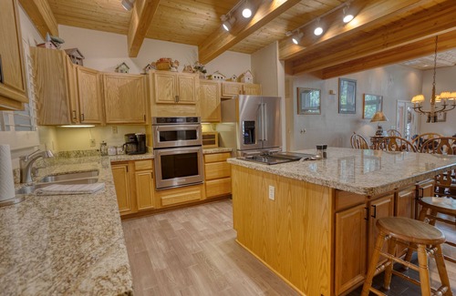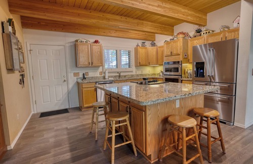 Sunset Timbers is over 2000 sf on a half-acre with 4 bedrooms, 2.5 baths, a loft and two outdoor sitting areas will fit your needs for just you and a special partner or the whole family. Modern furnishings, clean open spaces and high wood ceilings accent this amazing house. Rustic stone gas fireplace make the big room comfortable and a great place to look out the floor to ceiling front windows.